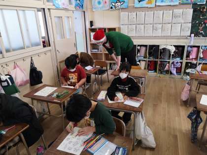 完成したクリスマスツリーは各クラス教室に飾っていますので、懇談のときぜひ見てみてくださいね。