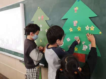ツリーを作り始める前に、イギリスでのクリスマスについて写真を見ながら、英語で勉強しました。そのあと、それぞれが色塗りしたオーナメントを大きな木に飾り付けて、クリスマスツリーを作りました!「サンタクロース」や「クリスマスケーキ」など、クリスマスにまつわる飾りがたくさんあり、子どもたちも楽しそうに作っていました。