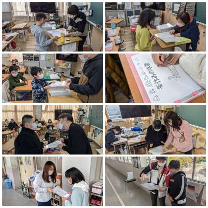 4年生は渡された子に拍手がおきるクラスもありました。宿題の表紙に色をぬりました。「まちがしさがし」は難しいようです。
