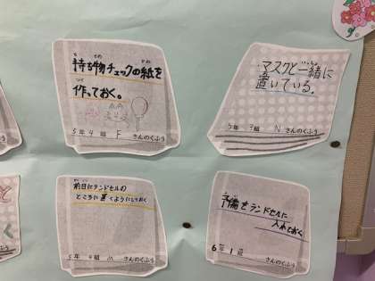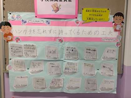 期間中には保健委員会が放送と手洗いの音楽を流しています。また、学校保健委員会の放送では紹介できなかった、1年生から6年生のハンカチを忘れずにもってくるための工夫についても保健室前に掲示しています。素晴らしい工夫がたくさん集まりました!