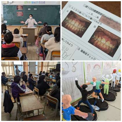 歯科衛生士さんにお越しいただき、歯と口の健康について教えていただきました。野生のサルと動物園のサルの歯の写真を見比べ、その違いから、歯磨きの重要性について学習しました。ていねいに歯を磨かないと、虫歯や歯周病の原因を作ることになります。虫歯になったら歯医者に行かないと治らないが、歯周病は歯磨きで防ぐことができることから、歯磨きの大切さをワークシートにまとめることができました。