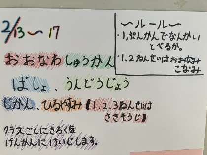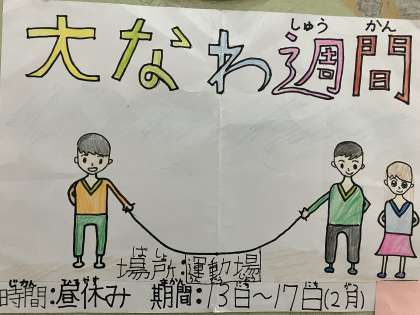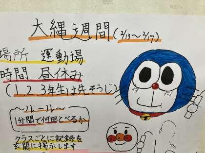 2月13日〜2月17日は、大繩記録週間です。運動委員会の児童が作成したポスターを、各学年の廊下に掲示しています。どのポスターも個性があり、大繩記録週間がとても楽しみになります。