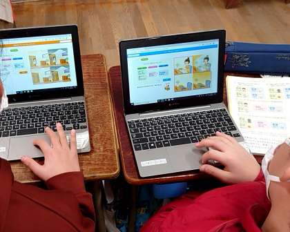 また、昨日は節電や省エネを目的としたセンサーの学習をしました。この内容では、タブレット端末を用いて、節電のプログラムを考えるプログラミング学習に取り組みました。