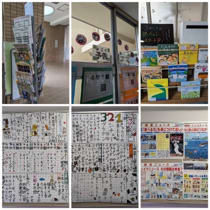 左上から、各種案内のちらし、おおなわ記録会の予告、読書チャレンジの案内、給食委員会新聞、子ども向けニュースです。