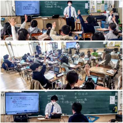 算数科の「□を使った式で表そう」では、タブレットを活用して自分の考えを書いたり、友だちの考えと交流したりしました。児童は減法の場面で、未知数を□として式やテープ図に表し、□に当てはまる数を調べる学習に意欲的に取り組んでいました。
