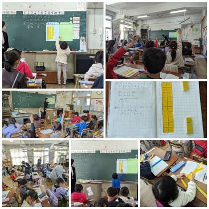 3時間目。15日に引き続き、教育センターより梶川先生にお越しいただきました。1年生の算数。具体的操作をしながら、二桁から一桁を引く(くり下がり無し)学習をしました。具体的操作は、想像力につながります。数をイメージし、そこからどれだけ無くなるかを想像します。これからの算数科教育のベースとなる学習でした。子どもたちは、意欲的に発表し、ノートもていねいに書くことができました。