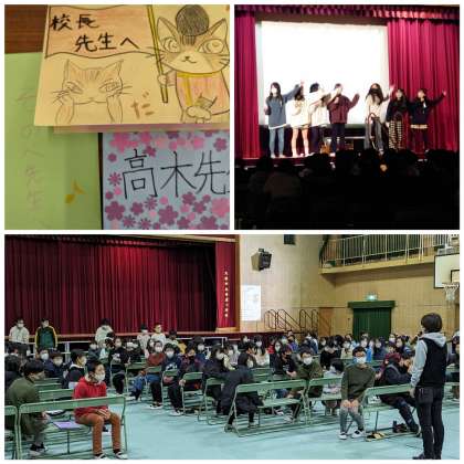 5,6時間目に茶話会をしました。短い準備期間でしたが、各クラス各グループは工夫を凝らした出し物を発表しました。発表することが好きな子、台本を書くのが得意な子、それぞれの役割で本領発揮!楽しい時間となりました。また、美味しいお菓子、ジュースもいただきました。卒業前の思い出ができました。
