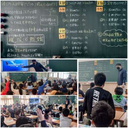 今日は理科の専科教員が4年1組の教室で、大阪市教育委員会『理科は面白い〜宇宙』を用いて「なぜロケットは宇宙に行けるのか?」の授業を行いました。