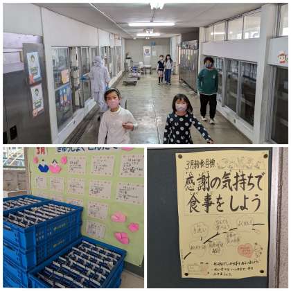 今年度の給食最終日です。毎日安全に、おいしい給食を作ってくださった朝日給食株式会社の皆様、ありがとうございました。
