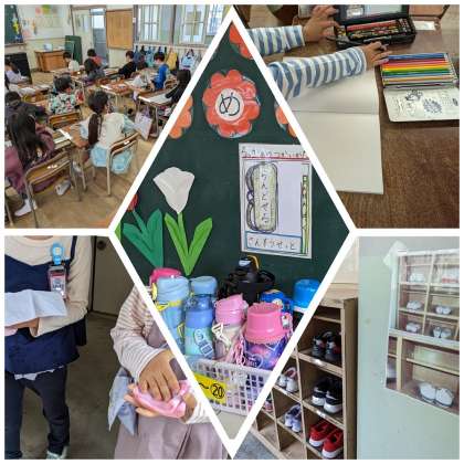 基本的な学校生活を学んでいます。ふでばこの中を整えること、トイレの使い方、水筒の置き方、靴の直し方・・・。1年生はがんばっていますよ!!