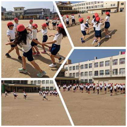 運動場から楽しそうな声が聞こえるな〜と思ったら、1組と2組の体育でした。体つくり、かけっこ、ボール投げと、様々な運動をしていました。