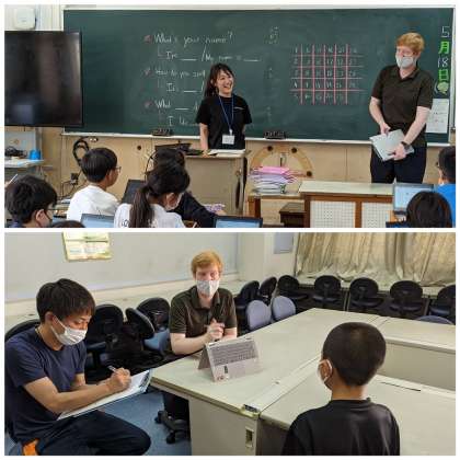今日は、5年生。ヒアリングのテストでは、ボーモント先生の質問を聞いて答えたり、お話したりしていました。担任の先生と英語で会話する場面では、先生も子どもも、自然と笑顔があふれます。