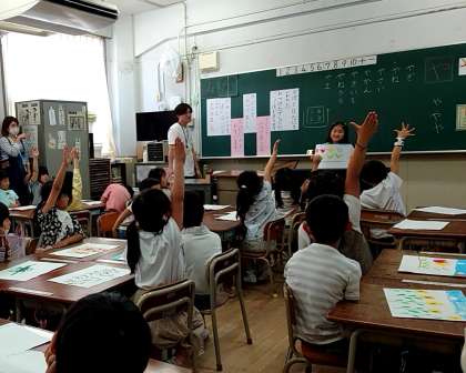 「ペア学年集会」以外の時間、1年生は国語科で言葉集め、6年生は社会科:選挙と政治についての学習参観をしました。1年生の教室では、「はい!!」という元気な挙手の声がたくさんあがっていました。また、6年生からは「思ってた以上に、いろいろなことを考えて候補者を選ばないと…」という、気づきの声があがっていました。