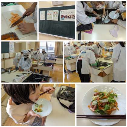 今週、6年生は家庭科調理実習で「野菜炒め」を作りました。栄養のバランスを考えて、一品添える料理を作りました。
