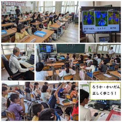 校長先生からは、校舎の北西にあるステンドグラスについて、「紫色の花「かきつばた」がデザインされています。紫色の花といえば、「しょうぶ」や「あやめ」があります。その違いは何でしょうか?花を見てきれいと思う心もすばらしいです。よく観察して、ちがいを見付ける目も大切です。」とお話がありました。校長先生からのクイズに元気に答える2年生、体をぴたっと止めて真剣に聞く4年生の姿を見ることができました。