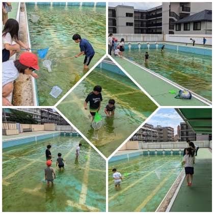 明日プールの掃除をします。もしかしたらヤゴ(トンボの幼虫)が捕まえられるかも!?と、先生付き添いのもと、一日プールを開放しました、逃げ回ったからか、残念ながら捕まえることはできませんでした。