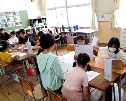 高学年は低学年のリーダーとなって活動します。1年生と手をつないで、優しくリードしている6年生の姿は、とても頼もしく見えました。各教室では、スタンプ係・案内係・ルール説明係・遊び係…とそれぞれに役割を担い、活動しています。笑顔でお客さんを迎えている人ばかりで、和やかな気持ちになれました。
