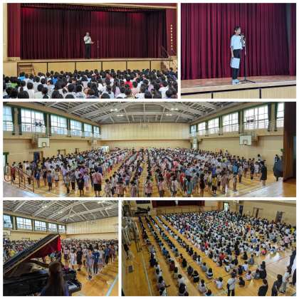 6年生代表児童から「1学期をふりかえりと2・3学期の抱負」のスピーチがありました。自分の話だけでなく、6年生として下級生を思いやった学校のリーダーとしての考えも伝えることができました。約700人を前に、原稿も見ずに、思いを伝えられたことは大変立派です。全校児童もきちっと最後まで聴くことができました。これもまた立派です!