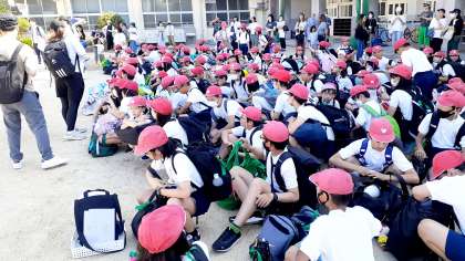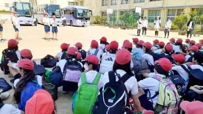 出発式で司会の児童が代表のあいさつや諸注意をしました。一生の思い出の林間学習になることでしょう!