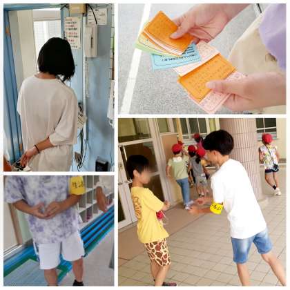 生活委員会の児童が、安全な歩行について職員室から放送で呼びかけたり、腕章をつけて「よくできましたカード」を配ったりしています。