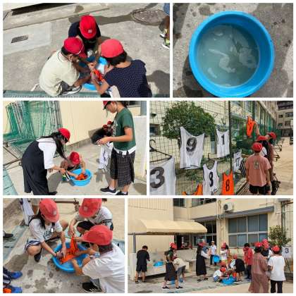見た目では汚れがひどくないゼッケンも、たらいの水が濁るのを見て、汚れていることがよくわかりました。