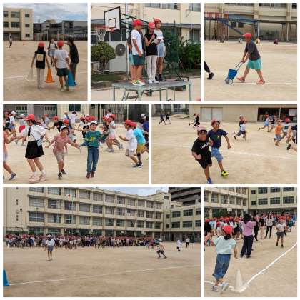 ルール説明は「船から岸まで、さめに食べられないように逃げてください。手は離さないでください。」ということでした。キャー!と楽しい声が運動場に響き渡り、あっという間に終わった感じがするおにごっこでした!