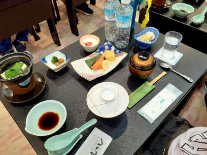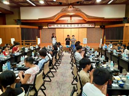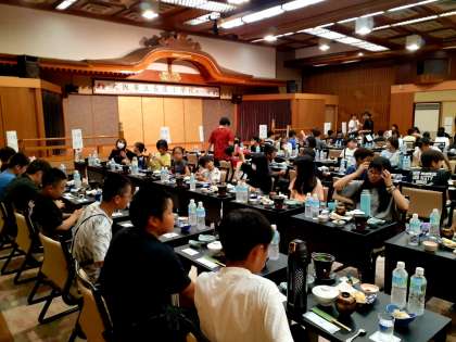 みんな元気です。食事係のあいさつは「今日もたくさん活動があります。感謝して、いただきます!」