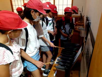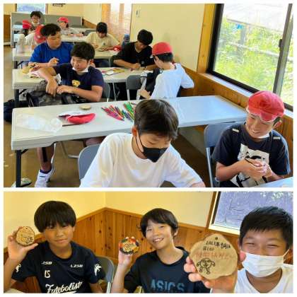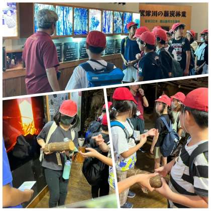 備長炭記念館の資料館で、炭について説明していただき、備長炭で音を出したりウバメバシの木をさわったりすることができました。ウッドペインティングでは、記念になる文言やイラストを描きました。