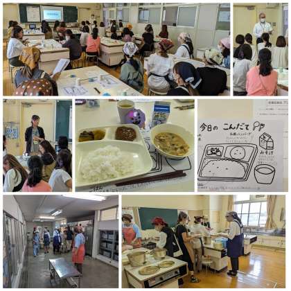 実施に給食室まで給食を取りに行き、児童と同じように配膳しました。「ハンバーグがふわふわでとってもおいしい!」「かぼちゃの味付け、どうしたらこんなに美味しくなるのかしら?」と、長居小学校の給食の美味しさを感じることができました。