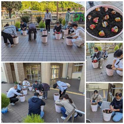 長居地域活動協議会とはぐくみネットの皆様が、今年もチューリップの球根を植えてくださいました。これは、来年度の入学式の頃に咲くように、新しい1年生をお花でお迎えできるようにと願って植えられています。植木鉢は管理作業員が作成しました。チューリップが満開になる春が楽しみです。