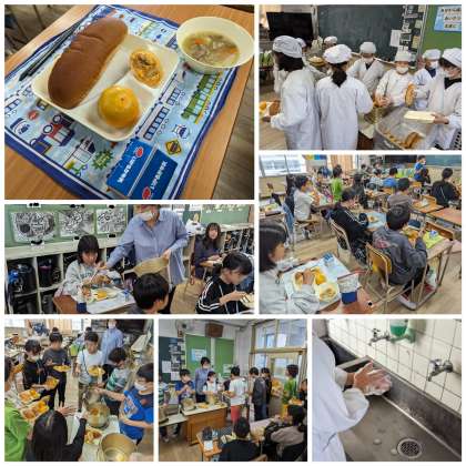写真は給食をもりもり食べる5年4組です。食缶に残ったものを先生が配って回ると、あちらこちらから手があがります。子どもたちだけで「おかわりじゃんけん」をして仲良く分けることができました。