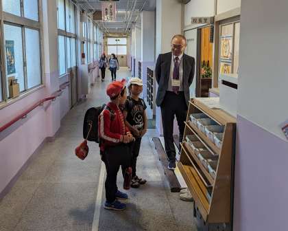 放課後の校長室前。4年生が、ろうかから校長室をのぞいて、校長先生に話しかけていました。何の話をしているのか聞いてみたら、話題は「くつべら」。「固い靴を履くときに使うと便利なんだよ」に、「べらって何やろうな〜?」「魚にもおったような…」と会話が弾んでいました(^^)下校前の穏やかなスケッチです♪