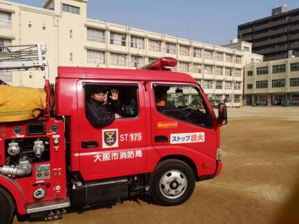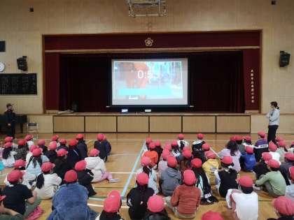 先日の防災教室では、消火隊員の方が、素早く現場に駆けつけ、消火活動をする様子を動画を見ながら解説していただきました。