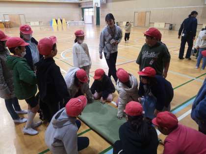 いざという時のために、物干し竿などの棒2本と毛布1枚で作れる応急担架の作り方を教わりました。先生を担いで、移動しても大丈夫なほどしっかりしていました。