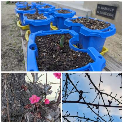 「春」を探していたら、1年生のチューリップが芽を出していました!桜のつぼみはまだまだでしたが、これからどんどん膨らむことでしょう。