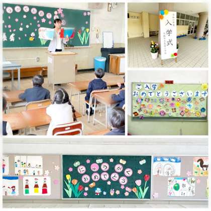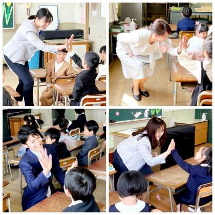 初めての教室。先生と1年生はハイタッチしながらあいさつしました!