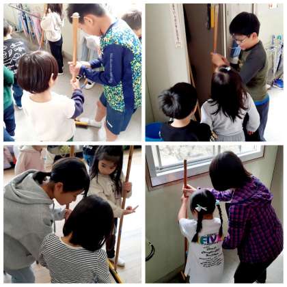 学校のリーダーの6年生は、1年生に掃除の仕方を優しく教えていました。