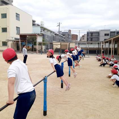 3年生が鉄棒で、基本的な上がり技やお腹でのぶら下がり遊びなどをしていました。