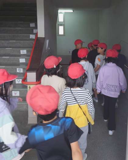 教頭先生から地震発生時に大切なこと「先生の指示を必ず守りましょう」のお話を聞いた後は、津波が来ることを想定して高所への避難を実施しました。2年生は4階の理科室前に避難しましたが、おしゃべりをしたり手遊びをしたりする人もなく、静かに待つことができました。教頭先生との約束、しっかり守れていました。