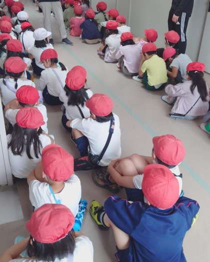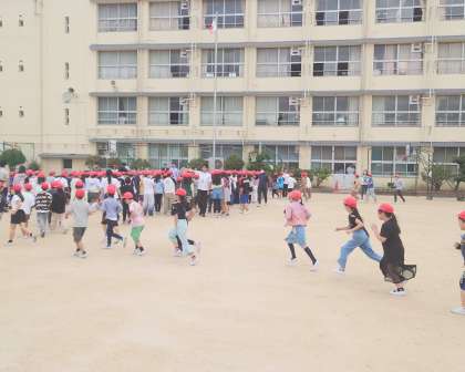運動場に避難するときは、急ぎながらもあせらず慌てず…「お・は・し・も」の約束を守って行動することが大切です。今回の避難訓練で全校児童が運動場に避難する時間はおよそ4分ほどでした。落ち着いて行動できる人が多くて立派でした。