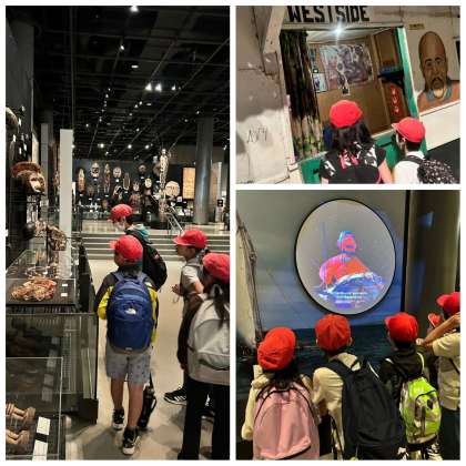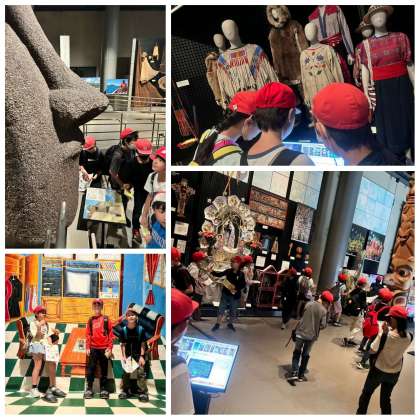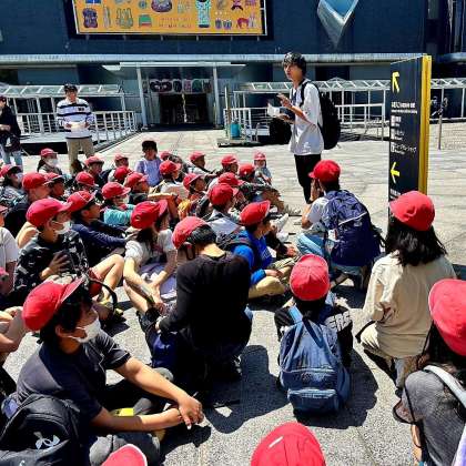 車内のマナーをしっかり守り、万博記念公園に到着しました。太陽の塔を眺めながら、国利民族学博物館(みんぱく)前に集合しています。