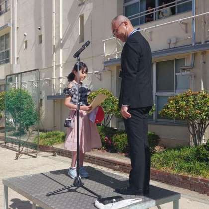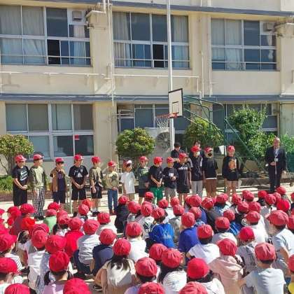 晴天のもと、ピアノをがんばっている児童と西日本の大会で好成績をおさめた長居ミニバスケットボールクラブの表彰を行い、あたたかい拍手につつまれました。
