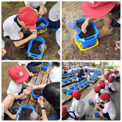 1年生は生活科で朝顔を育てます。水やりなどのお世話をして、大きくなる様子を観察していきます。きれいな花が咲きますように!