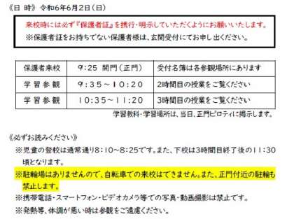 6月2日の日曜参観についてのお知らせです。