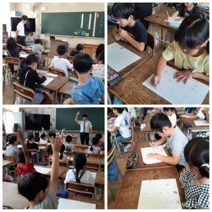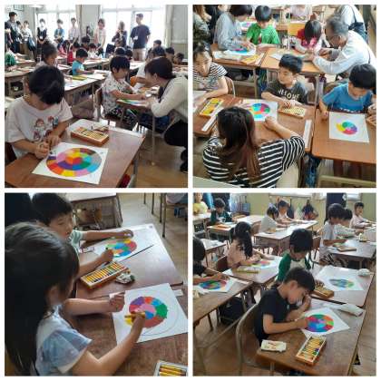 1年生は図画工作「くるくるかざり」算数「あわせていくつ」、2年生は図画工作「はじめてのえのぐ」国語「カタカナで書くことば」の学習でした。
