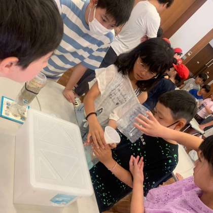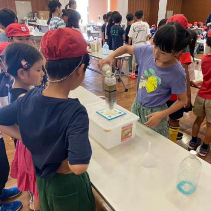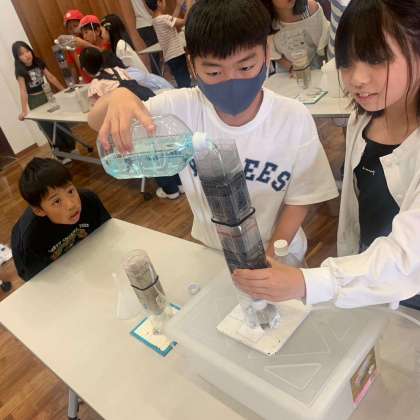 友だちと協力し、浄水処理工程の一部についてミニチュア模型で実験しています。