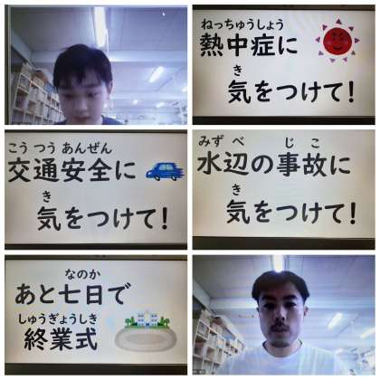 校長先生からは、命や体を守るために気を付けてほしいことや1学期の振り返りについて、看護当番の教員からは、通学路を通って登下校することについて話がありました。
