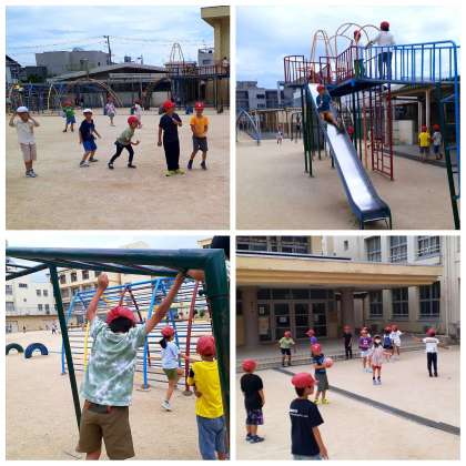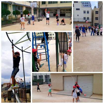曇り空のもと、運動場で元気に遊ぶ姿が見られました。バスケットボールやドッジボール、なわとびや遊具など、それぞれが楽しく体を動かしていました!