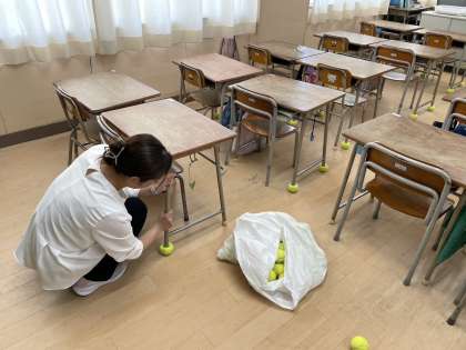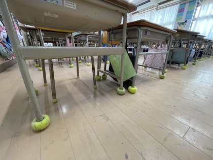 テニスボールを取り付けは、他学年にも順次広げていき、よりよい教室環境をめざしていきます。