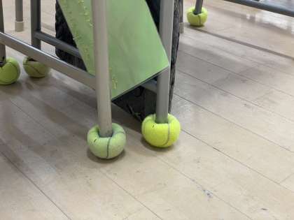 そこで、机の脚にテニスボールをつけて少しでもなめらかに、また静かに机を動かせるようになりました。